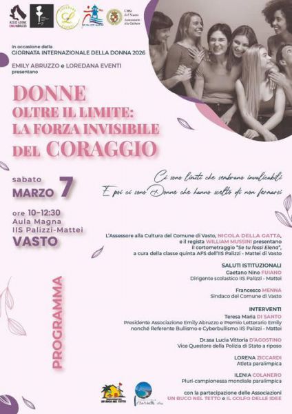 E proprio in sinergia con altre associazioni e realtà del territorio tra cui Loredana Eventi, il Comune di Vasto e le Associazioni Un buco nel tetto e Il Golfo delle idee, è stato pensato l’evento “Donne oltre il limite: la forza invisibile del coraggio” che si terrà sabato 7 marzo a Vasto in due diversi momenti della giornata: la mattina, a partire dalle ore 10:30, presso l’aula magna dell’IIS Palizzi Mattei e il pomeriggio, dalle ore 17:30 presso l’Auditorium dell’Ufficio Attività Culturali e Biblioteca di Via F. P. Michetti.