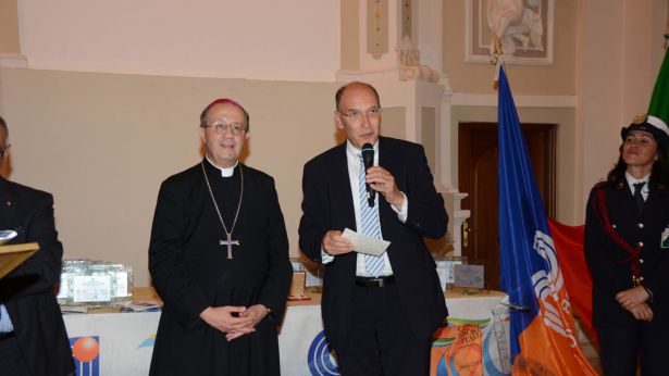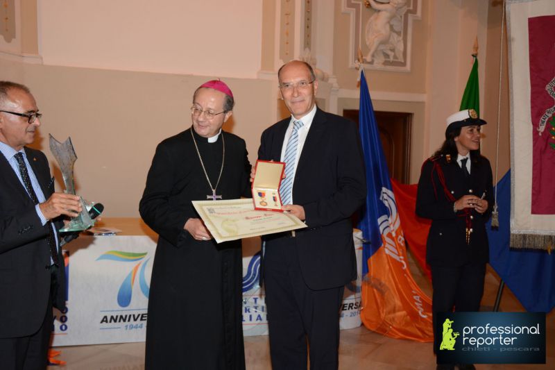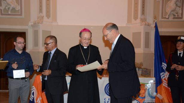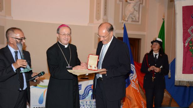 L'ambito riconoscimento consegnato da mons. Bruno ForteIeri sera, a Chieti, il Centro Sportivo Italiano ha festeggiato i 70 anni di presenza nella nostra Provincia. La cerimonia ha avuto svolgimento nell'Auditorium "Le Crocelle" con una larga partecipazione di Autorità religiose, civili e sportive. Ha fatto gli onori di casa mons. Bruno Forte, arcivescovo della nostra Arcidiocesi. Marco Rosati, presidente Provinciale del CSI di Chieti, ha svolto una interessante relazione sul tema: "Un servizio costante nella Chiesa e nella Società italiana". Nella circostanza Rosati e Mimmo Puracchio, animatore infaticabile del C.S.I., hanno anche presentato il programma di lavoro per l'anno associativo 2015-2016. Presente alla importante cerimonia don Alessio Albertini, assistente nazionale del C.S.I. Nel corso della serata è stato consegnato il Discobolo d'Oro al Merito C.S.I. "per l'impegno a favore dell'Associazione e della sua proposta sportiva-educativa" al direttore della nostra testata, Giuseppe Forte, presidente del Consiglio Comunale di Vasto. L'ambito risconoscimento è stato assegnato dal presidente nazionale del C.S.I. Massimo Achini anche a mons. Piero Santoro, vescoco dei Marsi, ed a Umberto Di Primio, sindaco di Chieti.La consegna delle insegne e del doploma di merito è avvenuta per mano di mons. Bruno Forte che ha avuto parole di apprezzamento per l'azione promozionale svolta da Giuseppe Forte nella comunità vastese. Nel corso della cerimonia sono stati premiati per l'attenzione mostrata nei confronti del C.S.I. anche il Sindaco di Vasto, Luciano Lapenna, ed il Sindaco di San Salvo, Tiziana Magnacca. Altri riconoscimenti sono stati consegnati a rappresentanti delle diverse realta del C.S.I. che operano nell'ambito della provincia Teatina. Al termine, nella cripta della Cattedrale di San Giustino, mons. Bruno Forte ha concelebrato un solenne rito religioso. La serata si è conclusa con il classico taglio della torta. |