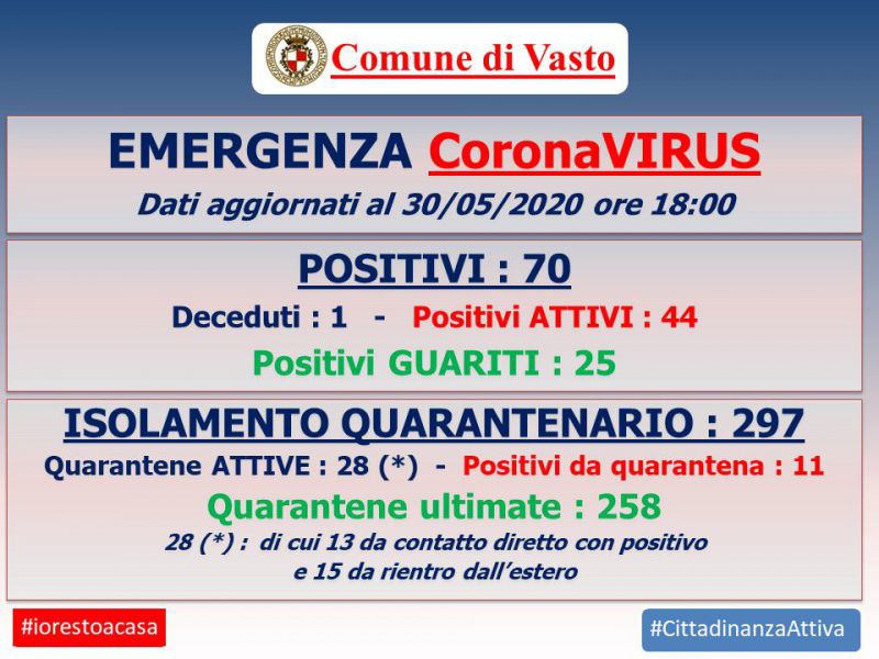 Sabato, 30 Maggio 2020 VastoA Vasto il coronavirus non trova soggetti deboliUna settimana trascorsa con risultati rassicurantiProsegue il trend positivo iniziato da una settimana. Anche oggi a Vasto non si sono registrati nuovi casi positivi al coronavirus. Il lavoro fatto, la tempestività dei provvedimenti adottati hanno avuto gli effetti sperati. |
