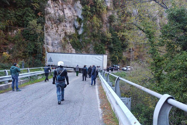 Mercoledì, 5 Novembre 2025 AbruzzoTir si incastra sulla statale, caos alle Gole del SagittarioAuto e bus studenti bloccati, i vigili del fuoco tagliano il guardrailUn lungo tir resta incastrato nel tentativo azzardato di fare manovra lungo la tortuosa strada statale 479 'Sannite', finendo per bloccarsi tra la parete rocciosa e il guardrail, lungo tutta la carreggiata. Lunga fila di auto ferme da oltre un'ora e anche un autobus con a bordo gli studenti di ritorno da Sulmona verso i paesini di montagna della valle del Sagittario fino a Scanno. Unico collegamento tra la valle del Sagittario e quella Peligna, la suggestiva SS 479, incastonata tra i monti, è anche di grande richiamo turistico per la bellezza panoramica delle Gole del Sagittario. Spesso soggetta a rallentamenti per via della carreggiata stretta, raramente viene attraversata da mezzi tanto imponenti. |