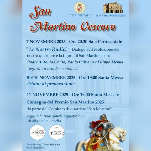 Venerdì, 7 Novembre 2025 VastoAppuntamenti all'Incoronata di Vasto per la Festa di San Martino VescovoQuesta sera, alle ore 20,30, nel salone parrocchiale dialogo sul tema “Le Nostre Radici”Appuntamenti nella comunità dell'Incoronata di Vasto per la Festa in onore di San Martino Vescovo. Si inizia venerdì 7 novembre, alle ore 20,30, nel salone parrocchiale con “Le Nostre Radici”, dialogo sull'evoluzione del quartiere e la figura di San Martino con la partecipazione del parroco Padre Antonio Levita, del prof. Paolo Calvano e di Filippo Menna. L'8, il 9 e il 10 triduo di preparazione con la Santa Messa alle ore 19. Martedì 11, giorno della festa, Santa Messa alle ore 19 e, a seguire, cerimonia di consegna del Premio San Martino 2025 da parte del comitato di quartiere con degustazione di olio e vino novello. |