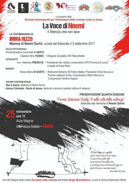 Martedì, 25 Novembre 2025 VastoÈ sempre 25 novembre per Emily AbruzzoTante le iniziative per celebrare la Giornata contro la violenza sulle donne e rinnovare l’impegno quotidiano dell’AssociazioneIn occasione della Giornata internazionale per l’eliminazione della violenza contro le donne che celebra domani, 25 novembre, diverse sono le iniziative organizzate sul territorio dall’Associazione Emily Abruzzo. Un modo per rinnovare l’impegno costante delle Associate che ogni giorno, da ormai vent'anni, promuovono azioni concrete di intervento, prevenzione e sensibilizzazione per ribadire forte e chiaro il messaggio di contrasto alla violenza, qualsiasi essa sia. “La voce di Noemi. Il silenzio che non tace” è il titolo del convegno che si terrà a Vasto: al mattino, dalle ore 11 presso l’Aula magna dell’Istituto di Istruzione Superiore “Palizzi-Mattei”; nel pomeriggio, dalle ore 14:30 presso l’Aula Impegno Solenne del Tribunale. A presenziare agli incontri Imma Rizzo, mamma di Noemi Durini, una ragazza barbaramente uccisa dal fidanzato a Castrignano del Capo nel 2013. Con lei, divenuta tristemente testimone di una delle forme di violenza più efferate, l'avvocato Valentina Presicce, suo legale nonché presidente dell’Associazione Astrea e componente CPO Provincia di Lecce. Durante gli incontri, il primo rivolto agli studenti e il secondo a tutta la cittadinanza e agli Avvocati (l’evento è stato accreditato dal Consiglio dell’Ordine degli Avvocati di Vasto con il riconoscimento di n. 2 crediti ai fini della formazione continua), verrà altresì presentata in anteprima la quarta edizione del Premio Letterario Emily "I mille volti della violenza” dedicato proprio alla memoria di Noemi. "Con l’iniziativa La voce di Noemi prende il via la quarta edizione del Premio Letterario Emily. La storia di Noemi, il suo ricordo e il coraggio della madre, Imma Rizzo, diventano il cuore di questa edizione speciale, nata per trasformare la memoria in impegno e sensibilizzare contro ogni forma di violenza di genere”- ha affermato Teresa Maria Di Santo, Presidente del Premio e dell’Associazione Emily Abruzzo nonché Referente del bullismo e cyberbullismo dell’IIS Palizzi-Mattei - "La testimonianza di Imma segna un momento di forte valore umano e civile: un invito a non restare indifferenti e a dare voce a tutte le donne che chiedono ascolto, rispetto e protezione, per confermare così la missione del Premio di promuovere e sostenere una cultura fondata sulla dignità, sulla consapevolezza e sulla prevenzione della violenza”. La cultura che si erge contro la violenza sarà protagonista anche di un altro incontro targato Emily Abruzzo, in collaborazione con l'Associazione culturale scernese Voci amiche: quello che avrà luogo sabato 29 novembre presso il Teatro San Silverio (ex Asilo parrocchiale) a Scerni. Qui si terrà la presentazione del libro Mostri. Quando non c'è più l’amore del giornalista e scrittore Giovanni Mancinone, terzo classificato della seconda edizione del Premio Letterario Emily. A dialogare con l'autore Teresa Di Santo e due volontarie dell'Associazione Emily, la psicologa e psicoterapeuta Anna Cimino e la dottoressa Valeria Rucci. Emily Abruzzo sarà inoltre “diversamente presente” anche presso i locali della Piscina Comunale di Vasto H20 Sport con l'iniziativa “Fermiamo la violenza!”: in collaborazione con la Direzione del Centro Nuoto, gli spogliatoi si popoleranno di adesivi con i recapiti di Emily e verranno distribuiti dei palloncini ai bambini che frequentano i corsi pomeridiani: un ottimo modo per ribadire l'impegno dell'Associazione presente h 24 per supportare chi ha bisogno di aiuto. |
