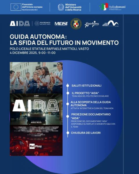 Giovedì 4 dicembre, dalle ore 9 alle ore 11, nella sede del Polo Liceale "R. Mattioli" di Vasto saranno presenti alcuni componenti del gruppo di ricerca AIDA - Artificial Intelligence Driving Autonomous, guidato dal professor Sergio M. Savaresi.