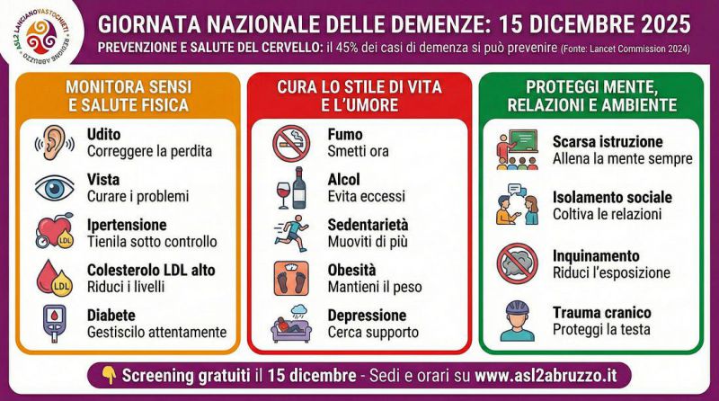Martedì, 9 Dicembre 2025 ChietiPrevenzione della demenza senileScreening gratuiti in provincia di Chieti il 15 dicembrePorte aperte nei centri specializzati di Chieti, Lanciano, Vasto e Ortona. Medici e psicologi a disposizione per test cognitivi rapidi e valutazioni sulla dieta mediterranea. Quasi la metà dei casi di demenza potrebbe essere evitata o ritardata: intervenendo tempestivamente su 14 fattori di rischio modificabili, è possibile abbattere l’incidenza della malattia fino al 45 per cento. È il dato scientifico, emerso dalle stime 2024 della Lancet commission on dementia prevention, da cui parte la prima “Giornata nazionale delle demenze”. La Asl Lanciano Vasto Chieti apre le porte dei suoi centri specializzati: lunedì 15 dicembre 2025 sarà possibile sottoporsi gratuitamente a uno screening della memoria e ricevere consulenze sulla salute cerebrale. L’iniziativa mobilita l’intera rete dei Centri per i disturbi cognitivi e le demenze (Cdcd) della provincia, presenti sia in ospedale sia sul territorio. L’obiettivo è intercettare i segnali precoci: i disturbi cognitivi, infatti, tendono a esordire in modo graduale, con avvisaglie sfumate che spesso sono sottovalutate fino a quando il quadro clinico non è compromesso. La diagnosi tempestiva resta il passaggio fondamentale per proteggere la qualità della vita. La giornata nazionale è promossa dall’associazione SINdem. Durante l’open day, gli specialisti non si limiteranno a un colloquio informativo. In tutte le sedi aziendali saranno somministrati brevi test cognitivi standardizzati, progettati per valutare lo stato di salute mentale in relazione ai fattori di rischio chiave: ipertensione, colesterolo alto, diabete, obesità, fumo, alcol, sedentarietà, disturbi dell’umore, isolamento sociale, traumi cranici pregressi, esposizione all’inquinamento, oltre a eventuali deficit di vista e udito. Un focus specifico sarà dedicato all’alimentazione, prima alleata del cervello. Agli utenti sarà sottoposta una scheda di valutazione sull’aderenza alla dieta mediterranea, per analizzare le abitudini a tavola: dal consumo di olio extravergine d’oliva e frutta secca a quello di legumi, pesce e carni bianche, fino alla gestione degli zuccheri. Per gestire l’afflusso e garantire a tutti un colloquio approfondito, la Asl ha differenziato le modalità di accesso tra il capoluogo e il resto del territorio. Nell’ospedale di Chieti serve la prenotazione Per chi sceglie il “SS. Annunziata”, è indispensabile fissare l’appuntamento online (a questo link: https://forms.gle/SzjqGQm2Yrr286X78). Le visite si svolgeranno nella Clinica neurologica referente Mirella Russo).Medicina generale 2 (referente Ida Bottone). Sul territorio e negli altri ospedali: accesso libero Chieti (distretto sanitario): via Tiro a Segno 1. Screening dalle ore 8.30 alle 12.00 (referente Claudia Manzoli). |