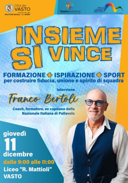 Gli assessorati alle Politiche sociali e allo Sport del Comune di Vasto, in collaborazione con il Polo Liceale “R. Mattioli”, promuovono l’iniziativa “Insieme si vince”, un appuntamento dedicato alla crescita personale e collettiva attraverso i valori dello sport, della formazione e della motivazione.