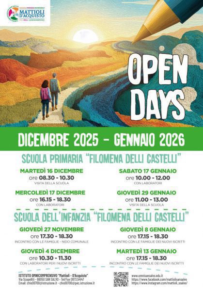 Giovedì, 11 Dicembre 2025 San SalvoOpen day al Mattioli-D’Acquisto di San SalvoLa scuola vicino che ti porta lontanoAnche quest’anno, in occasione dell’OPEN DAY, l’Istituto Omnicomprensivo “Mattioli-D’Acquisto” di San Salvo tornerà ad accogliere alunni e genitori con un fitto calendario di incontri. Si parte nella Secondaria di I grado venerdì 12 dicembre dalle ore 17:00 alle 19:00 presso il plesso di Via Scopelliti.L’iniziativa è dedicata agli alunni delle classi quinte della scuolaprimaria e alle loro famiglie, con l’obiettivo di accompagnarli alla scoperta della loro futura realtà scolastica. L’evento sarà inaugurato dalla Dirigente prof.ssa Annarosa Costantini, che illustrerà le novità dell’ampliamento dell’offerta formativa ele prospettive educative e didattiche dell’istituto, da sempreattento alla crescita personale e al successo formativo degli studenti. A seguire, le famiglie potranno partecipare a un ricco programma di laboratori didattici ideati e condotti da docenti ealunni, pensati per offrire ai futuri alunni un’esperienza diretta, partecipata e coinvolgente. Durante il pomeriggio sarà inoltre presente il Consiglio Comunale dei Ragazzi, che presenterà progetti e iniziative incorso. L’atmosfera sarà arricchita dagli interventi del coro scolastico e dell’orchestra, testimonianza della viva dimensione musicale dell’istituto. L’appuntamento succssivo è previsto il 23 gennaio, stavolta presso la sede di Via Montegrappa,. Gli indirizzi della secondaria superiore apriranno invece le porte sabato 13 dicembre presso le 2 sedi di via Montegrappa con un pomeriggio di condivisione, scoperta e conoscenza dell’offerta formativa della scuola dalle 17:00 alle 19:00. Oltre a visitare l’Istituto, verranno presentati i laboratori sempre più innovativi (scienze, fisica, colture idroponiche, lingue, informatica, metodologie operative, benessere psico-fisico, misure elettriche ed elettroniche, robotica, industria 4.0, stampa 3D) e la palestra/palazzetto dello sport. L’Open Day delle scuole superiori verrà replicato poi venerdì 16 gennaio con i medesimi orari e programma. Attualmente gli indirizzi attivi sono: • Liceo Scientifico: Nuovo Ordinamento e Opzione Scienze Applicate; Più articolato il programma del primo ciclo presso la primaria e la scuola dell’infanzia “Filomena Delli Castelli”, che osserverà il seguente calendario presso la sede di via Melvin Jones: PRIMARIA > martedì 16 dicembre dalle 8:30 alle 10:30 (visita della scuola) > mercoledì 17 dicembre dalle 16:15 alle 18:30 (con laboratori) > sabato 17 gennaio dalle 10:00 alle 12:00 (con laboratori) > giovedì 29 gennaio dalle 11:00 alle 13:00 (visita dlla scuola) INFANZIA > giovedì 8 e martedì 13 gennaio dalle 17:15 alle 18:30 (incontro famiglie nuovi iscritti) La Dirigente Scolastica Annarosa Costantini e i docenti dialogheranno con le famiglie per illustrare la visione di una scuola che guarda al futuro. Partecipare a queste giornate rappresenta un’occasione unica per conoscere un’istituzione che punta all’eccellenza educativa. Non mancate! |