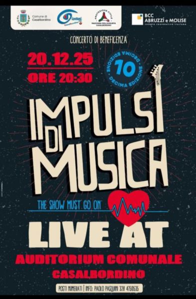 Venerdì, 19 Dicembre 2025 Vastese'Impulsi di Musica', serata speciale tra talento e solidarietàSabato 20 dicembre l'appuntamento all'Auditorium Tito MolisaniSabato 20 dicembre, nella cornice dell’Auditorium Tito Molisani di Casalbordino, andrà in scena Impulsi di Musica, la rassegna musicale ideata da Paolo Pasquini che quest’anno compie 10 anni e che, a detta dei partecipanti, “sarà la più bella edizione mai fatta fino ad oggi”. La serata vedrà protagonista un collettivo di musicisti che, coniugando talento e solidarietà, offrirà al pubblico musica per tutti i palati: dal pop al rock, dalla leggera al blues, dalla dance al jazz. La rassegna, a sfondo benefico, regalerà al pubblico una serata di musica dal vivo con artisti locali che si alterneranno sul palco in un programma pensato per valorizzare il talento del territorio. Inizio spettacolo ore 20,30. Ingresso € 10 Auditorium Tito Molisani: Via Martiri dell'11 Settembre, 5 - 66021 Casalbordino Info e biglietti: Paolo 3284750535 |