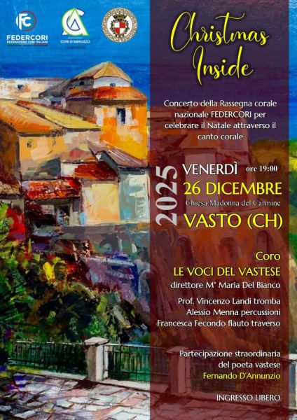 Martedì, 23 Dicembre 2025 Vasto'Christmas Inside', musica e poesia alla Chiesa della Madonna del CarmineConcerto del "Le Voci del Vastese" diretto dal M° Maria del BiancoVenerdì 26 dicembre alle ore 19, nella Chiesa della Madonna del Carmine di Vasto, con il Coro Le Voci del Vastese diretto dal M° Maria del Bianco, il pubblico presente avrà l'opportunità di ascoltare il poeta vastese Fernando D'Annunzio. Suoneranno dal vivo: al flauto traverso Francesca Fecondo, alla tromba il Prof. Vincenzo Landi e alle percussioni Alessio Menna. Lino Davino |