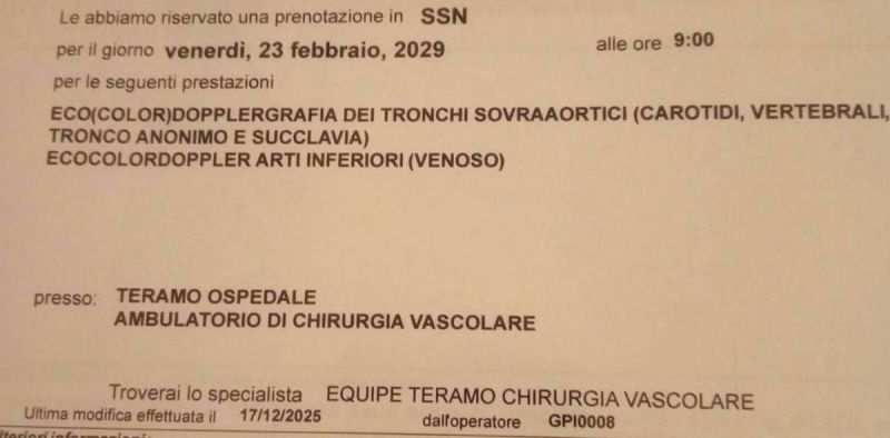Martedì, 30 Dicembre 2025 AbruzzoPer un esame ecocolordoppler un cittadino invitato a ripassare 23 febbraio 2029Il consigliere regionale Peppe dice: “Così la sanità pubblica muore"”Un esame importante come quello di ecocolordopplergrafia dei tronchi sopraortici e di ecocolordoppler agli arti inferiori prenotato il 15 dicembre al cup della Asl di Teramo, fissato nello sconcerto del paziente al 23 febbraio del 2029 alle ore 9.00. A denunciarlo è stato in consiglio regionale Dino Pepe, consigliere del Partito democratico nella discussione sulla legge di Bilancio, in corso di svolgimento all'Emiciclo dell'Aquila, rivolgendosi all'assessore alla Salute, Nicoletta Verì, ha cui ha anche inviato per conoscenza il documento di prenotazione. "Non è possibile, è vergognoso che un cittadino debba aspettare tre anni per avere una prestazione a cui ha diritto. Se avrà la possibilità dovrà ora recarsi alla sanità privata, o le sue condizioni di salute senza visite specialistiche, saranno destinate a peggiorare". Ha poi incalzato, interpellato al termine del suo intervento ad Abruzzoweb, "la questione delle liste d'attesa non è stata affrontata dal presidente di Fdi Marco Marsilio e Verì in questi anni e questi sono i vergognosi risultati, certificati anche dal recente report della Fondazione Gimbe. Su 1.300.000 abitanti di questa regione 100.000 non si cura più, perché non ne hanno possibilità, 5oo.ooo vanno a curarsi altrove". E le cose per Pepe sono destinate a peggiorare, "entro il 3o gennaio la Regione dovrà approvare il Piano |