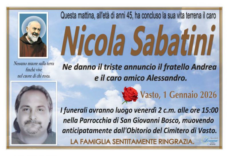 Giovedì, 1 Gennaio 2026 VastoUn giovane di 45 anni di Vasto trovato morto in casa di un amico a CupelloSarebbe stato stroncato da un improvviso maloreÈ stato trovato privo di vita all’interno dell’abitazione di un amico in via Istonia, a Cupello, un uomo, Nicola Sabatini di 45 anni, residente a Vasto. La scoperta è avvenuta nella mattinata del 1° gennaio 2026. Secondo le prime ricostruzioni, il decesso sarebbe avvenuto per cause naturali, con ogni probabilità in seguito a un arresto cardiocircolatorio. Sabatini era ospite dell’amico per il Capodanno. Sul posto sono intervenuti i sanitari del 118, che non hanno potuto far altro che constatare il decesso. Presenti anche i carabinieri della stazione locale per i rilievi e gli accertamenti di rito. Al momento non sono emersi elementi che facciano ipotizzare dinamiche diverse da una morte naturale. Il funerale di Nicola Sabatini sarà celebrato domani, venerdì 2 gennaio, alle ore 15,00 nella Chiesa di San Giovanni Bosco a Vasto.