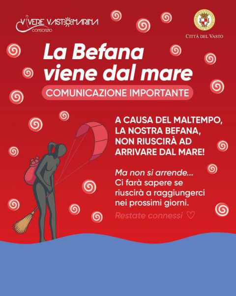Lunedì, 5 Gennaio 2026 Vasto'La Befana viene dal mare', appuntamento rinviatoA causa del maltempo gli organizzatori hanno rinviato l'eventoRinviato l'appuntamento “La Befana viene dal mare”, in calendario nella mattinata festiva del 6 gennaio a Vasto Marina. La comunicazione è degli organizzatori del Consorzio Vivere Vasto Marina. “A causa del maltempo, domani 6 gennaio, la nostra Befana non riuscirà a venire dal mare come previsto. La Befana però non si arrende e ci farà sapere presto se riuscirà a raggiungerci nei prossimi giorni”. |