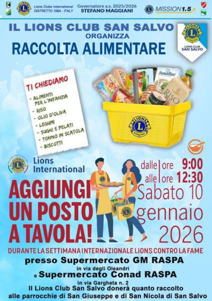 Mercoledì, 7 Gennaio 2026 San Salvo‘Aggiungi un posto a tavola’, raccolta alimentare sabato 10 gennaioIniziativa dei soci del locale Lions ClubIl Lions Club San Salvo aderisce al service nazionale “Aggiungi un posto a tavola”, in occasione della Settimana Internazionale contro la Fame, con una Raccolta alimentare aperta a tutta la cittadinanza. L’appuntamento è per sabato 10 gennaio dalle ore 9:00 alle ore 12:30 presso i due supermercati Conad della città. Tutti i beni raccolti saranno donati alle parrocchie, che li distribuiranno alle famiglie bisognose del nostro territorio. “Un gesto semplice può fare la differenza per chi vive un momento di difficoltà. Invitiamo tutti a partecipare con generosità” afferma Virginio Di Pierro , Presidente Lions Club San Salvo. Un piccolo contributo da parte di ciascuno può riempire tanti piatti vuoti. |