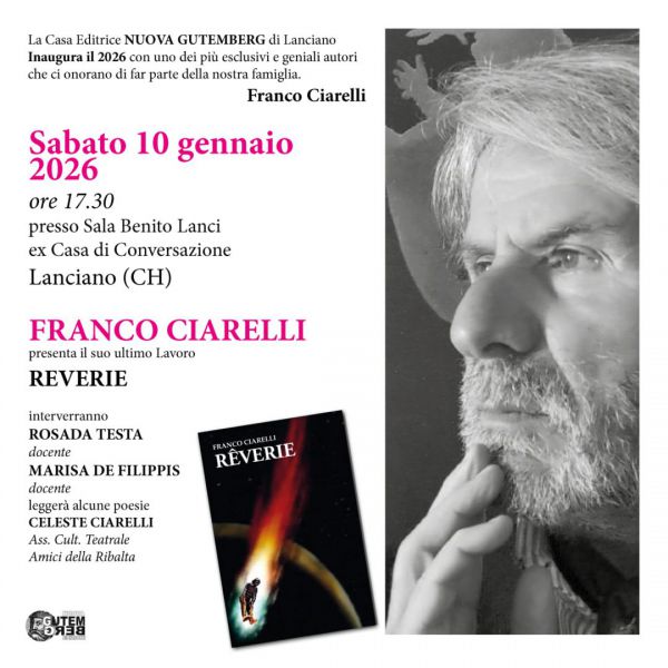 Mercoledì, 7 Gennaio 2026 VasteseNuova Gutemberg inaugura il 2026 con Franco CiarelliA Lanciano la presentazione di RèverieLa Casa Editrice Nuova Gutemberg di Lanciano inaugura il 2026 con un appuntamento culturale di grande rilievo, dedicato a uno degli autori più originali e apprezzati del panorama letterario contemporaneo: Franco Ciarelli. L’evento si terrà sabato 10 gennaio 2026, alle ore 17.30, presso la Sala Benito Lanci (ex Casa di Conversazione) a Lanciano (CH). Nel corso dell’incontro, Franco Ciarelli presenterà il suo ultimo lavoro, Rèverie, un’opera che conferma la profondità poetica e la cifra stilistica dell’autore, da anni punto di riferimento nel catalogo della Nuova Gutemberg. Interverranno le docenti Rosada Testa e Marisa De Filippis. Alcune poesie tratte dall’opera saranno lette da Celeste Ciarelli, dell’Associazione Culturale Teatrale Amici della Ribalta. L’incontro rappresenta non solo la presentazione di un nuovo libro, ma anche un momento di condivisione culturale e artistica, con cui la Nuova Gutemberg rinnova il proprio impegno nella valorizzazione della poesia e degli autori che fanno parte della sua famiglia editoriale. L’ingresso è libero. |