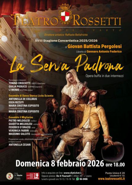 Sabato, 7 Febbraio 2026 VastoDomani al Teatro Rossetti il concerto “La serva padrona”Della Gatta: "Un’occasione preziosa per ritrovare il piacere del teatro musicale dal vivo"Domani, domenica 8 febbraio, alle ore 18.00, il Teatro Rossetti ospita “La serva padrona” di Giovan Battista Pergolesi, capolavoro fondativo dell’opera buffa e simbolo della Scuola Napoletana. L’opera, su libretto di Gennaro Antonio Federico, sarà presentata in allestimento semi-scenico con ensemble d’archi e clavicembalo. La produzione è affidata alla regia e preparazione vocale di Antonella Cesari e all’ensemble “Il Migliarino” diretto da Massimo Salcito. «Con “La serva padrona” – dichiarano il sindaco Francesco Menna e l’assessore alla Cultura e al Turismo Nicola Della Gatta – il Teatro Rossetti accoglie uno dei titoli più importanti della storia dell’opera, un capolavoro capace di unire leggerezza, intelligenza e profondità musicale. Un’occasione preziosa per ritrovare il piacere del teatro musicale dal vivo: invitiamo la cittadinanza e gli appassionati a partecipare e a condividere un’esperienza di bellezza e qualità artistica». Per informazioni e biglietti: https://teatrorossetti.it/biglietti.
