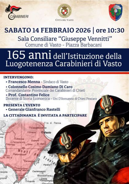 Venerdì, 13 Febbraio 2026 VastoVasto si appresta a festeggiare il 165° anniversario della presenza dei CarabinieriLa istituzione della Luogotenenza dell'Arma Benemerita risale al 1861L’Amministrazione Comunale di Vasto, il Comando Provinciale dei Carabinieri di Chieti e l’Associazione Nazionale Carabinieri – Sezione di Vasto, in occasione della ricorrenza del 165° anniversario di istituzione della Luogotenenza dei Carabinieri nella Citta del Vasto, hanno organizzato per domani, sabato14 febbraio, un importante momento istituzionale. Alle ore 10,30, presso la Sala Consiliare Giuseppe Vennitti del Comune di Vasto, avrà luogo una cerimonia nel corso del quale sarà presentato il calendario degli eventi celebrativi previsti nel corso 2026. L'evento sarà coordinato dal Gen. Gianfranco Rastelli il quale avrà anche il compito di illustrare gli importanti appuntamenti programmati per l'anno in corso. E' previsto un intervento del prof. Costantino Felice scrittore e storico. Saranno presenti i Sindaci dei Comuni del territorio del Vastese, i rappresentanti dell'Arma dei Carabinieri e delle Istituzioni. La cerimonia è stata annunciata dal Sindaco di Vasto Francesco Menna, dal Comandante Provinciale dei |