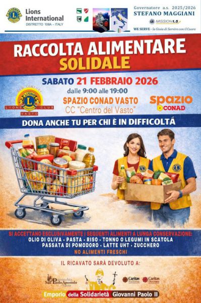 Martedì, 17 Febbraio 2026 VastoIl Lions Club Vasto New Century si attiva per la raccolta alimentare per l'Emporio della Solidarietà Giovanni Paolo IISabato 21 febbraio, dalle ore 9.00 alle ore 19.00, presso Spazio Conad – Centro Commerciale Centro del Vasto, in Via Luigi Cardone 32Il Lions Club Vasto New Century promuove una nuova raccolta alimentare a sostegno dell’Emporio della Solidarietà Giovanni Paolo II, Opera Segno della Caritas diocesana attiva nel quartiere San Paolo. L’iniziativa - si sottolinea in una nota del Club - si svolgerà sabato 21 febbraio, dalle ore 9.00 alle ore 19.00, presso Spazio Conad – Centro Commerciale Centro del Vasto, in Via Luigi Cardone 32. Si tratta di un appuntamento ormai consueto nel calendario delle attività del Club, un service che negli anni ha consolidato il proprio valore sociale, confermandosi come un gesto concreto della città per la città. Durante l’intera giornata, i soci del Lions Club saranno presenti per raccogliere beni di prima necessità destinati a persone e famiglie che vivono situazioni di difficoltà economica. L’Emporio della Solidarietà Giovanni Paolo II rappresenta un presidio fondamentale del territorio vastese: attraverso la distribuzione organizzata di generi alimentari e prodotti essenziali, sostiene numerosi nuclei familiari, offrendo un aiuto tangibile nel fronteggiare le esigenze quotidiane. La raccolta alimentare si inserisce in questo contesto come strumento diretto di supporto e prossimità. Determinante è la collaborazione con Spazio Conad – Centro Commerciale Centro del Vasto, che negli anni ha dimostrato sensibilità verso le iniziative promosse dal Lions Club, mettendo a disposizione spazi e favorendo la partecipazione della comunità. La sinergia tra realtà associative e operatori del territorio testimonia come il contributo di ciascuno possa tradursi in un sostegno concreto per chi attraversa momenti di fragilità. Il Lions Club Vasto New Century invita pertanto la cittadinanza a partecipare con generosità all’iniziativa, contribuendo con l’acquisto e la donazione di beni di prima necessità. Un piccolo gesto individuale può diventare un aiuto significativo per molte famiglie del territorio. |