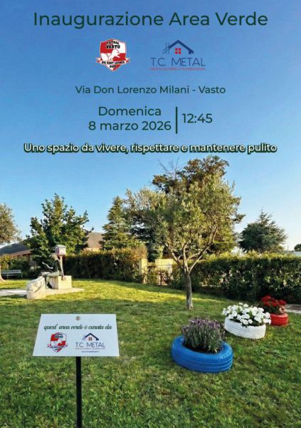 Venerdì, 6 Marzo 2026 VastoL’8 Marzo l’inaugurazione dell’area verde in via Don Lorenzo MilaniIniziativa dell’ASD FUTSAL VASTO in collaborazione con la TC METALIl prossimo 8 Marzo alle 12:45, l’ASD FUTSAL VASTO in collaborazione con la TC METAL, inaugurerà l’area verde in via Don Lorenzo Milani angolo via Conti Ricci. Quest’ area, che ospita il monumento di Don Milani per opera del presidente del Club per l’UNESCO di Vasto, Bianca Campli, si trova in una zona molto frequentata per lo più da studenti. Si tratta della seconda area verde curata dalla ASD FUTSAL VASTO evidenziando l’interesse che la società mostra nei confronti della sua città. Questo progetto promuove la sinergia tra la ASD FUTSAL VASTO, la TC METAL e il comune di Vasto al fine di rendere questo spazio più accogliente e sostenibile.