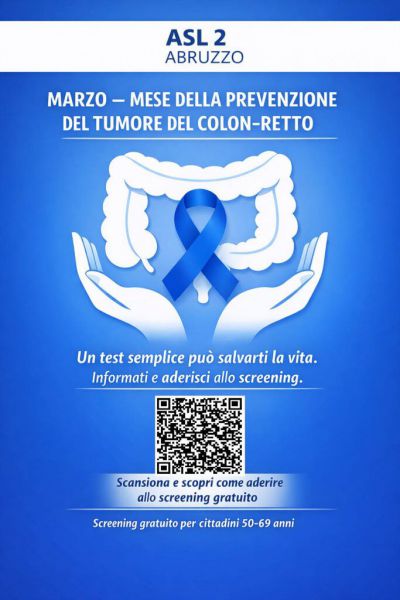 Venerdì, 6 Marzo 2026 ChietiMarzo, mese della prevenzione del tumore del colon-rettoLa Asl Lanciano Vasto Chieti invita allo screening gratuitoUn test semplice, eseguito comodamente a casa, può salvare la vita. A marzo, mese dedicato alla prevenzione del tumore del colon-retto, la Asl Lanciano Vasto Chieti, attraverso i propri servizi di screening e di endoscopia, rinnova l’invito a tutti i cittadini residenti nella fascia di età compresa tra i 50 e i 69 anni a partecipare attivamente ai programmi di diagnosi precoce. Il tumore del colon-retto rappresenta, per incidenza, la seconda patologia oncologica in Italia e in Europa. Tuttavia, un’azione preventiva tempestiva può fare un’enorme differenza. Poiché questo tipo di tumore si sviluppa spesso silenziosamente, a partire da polipi benigni che impiegano anni per degenerare, individuare per tempo anomalie come il sanguinamento invisibile a occhio nudo (sangue occulto) è fondamentale. «Abbiamo la possibilità di anticipare eventuali diagnosi maligne – sottolinea il direttore generale della Asl, Mauro Palmieri – e non va sprecata se abbiamo a cuore la nostra salute. Ai cittadini viene richiesto un impegno davvero minimo per partecipare allo screening, che a breve sarà anche ulteriormente incentivato con nuove azioni allo studio di questa Direzione». Come funziona lo screening Il prelievo si effettua in modo del tutto indolore al proprio domicilio. Successivamente, la provetta può essere riconsegnata con facilità al proprio distretto sanitario di appartenenza che si occuperà di conservare e inviare i campioni al Centro screening. I risultati e i passi successivi Contatti utili |
