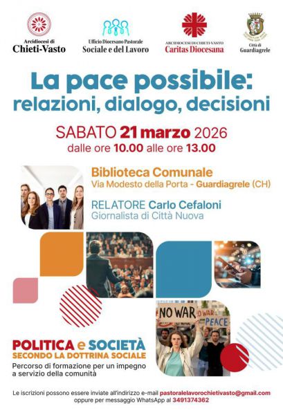 Mercoledì, 18 Marzo 2026 Chieti"Politica e Società", terzo appuntamento sulla pace con il giornalista Carlo CefaloniL’incontro si terrà sabato 21 marzo, dalle ore 10.00 alle ore 13.00, presso la Biblioteca Comunale di GuardiagreleProsegue con successo il percorso di formazione "Politica e Società secondo la Dottrina Sociale", l’iniziativa promossa dall’Arcidiocesi di Chieti-Vasto attraverso l’Ufficio Diocesano per la Pastorale Sociale e del Lavoro e la Caritas Diocesana. Dopo aver approfondito i temi della partecipazione e dell’economia civile, il terzo appuntamento sarà dedicato a un tema di stretta attualità: "La pace possibile: relazioni, dialogo, decisioni”. L’incontro si terrà sabato 21 marzo, dalle ore 10.00 alle ore 13.00, presso la Biblioteca Comunale di Guardiagrele (Via Modesto della Porta). L’evento vede il patrocinio e la collaborazione della Città di Guardiagrele. In un contesto globale segnato da profondi conflitti, la Dottrina Sociale della Chiesa offre una bussola per orientarsi nella costruzione di una pace che non sia solo assenza di guerra, ma frutto di giustizia e dialogo. La tappa di Guardiagrele esplorerà come le decisioni politiche e le relazioni umane possano diventare strumenti concreti per disinnescare la violenza e promuovere la convivenza civile. A guidare la riflessione sarà Carlo Cefaloni, firma autorevole del giornalismo sociale e redattore della rivista Città Nuova. Cefaloni è un giornalista professionista impegnato da anni nel racconto delle dinamiche sociali, economiche e dei movimenti per la pace. Esperto di Dottrina Sociale della Chiesa, collabora attivamente con diverse realtà del terzo settore e dell'associazionismo. La sua attività si concentra in particolare sull'analisi dei conflitti, il disarmo e la promozione di un'economia che ripudia la guerra. Attraverso i suoi editoriali e inchieste, Cefaloni propone una visione della pace intesa come impegno quotidiano e responsabilità collettiva, in linea con il magistero pontificio. «Parlare di pace oggi - spiega l’avv. Daniela Palladinetti, responsabile dell’Ufficio diocesano per la Pastorale Sociale e del lavoro - non è un esercizio teorico, ma un'urgenza politica. Con Carlo Cefaloni vogliamo capire come il dialogo possa diventare un metodo di decisione anche a livello locale. La 'pace possibile' di cui discuteremo a Guardiagrele parte dalla capacità di abitare le relazioni e di assumere scelte coraggiose per il bene della nostra comunità». L'itinerario formativo proseguirà con altre tre tappe, sempre di sabato dalle 10.00 alle 13.00: • 18 aprile – Francavilla al Mare: La democrazia nei territori: istituzioni locali, comunità, persone. Relatore: Antonio Campati (Docente Università Cattolica di Milano). • 16 maggio – Vasto: Il lavoro degno: diritti, opportunità, futuro. Relatore: Marco Bentivogli (Esperto innovazione industria e lavoro). • 20 giugno – Atessa: La sfida digitale: comunicare, informare, responsabilizzare. Relatrice: Chiara Santomiero (Giornalista e scrittrice). La partecipazione è libera e aperta a tutti. Per ragioni organizzative, le iscrizioni possono essere inviate via e-mail a pastoralelavorochietivasto@gmail.com o tramite messaggio WhatsApp al numero 349 1374362. |