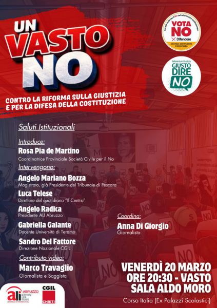 Giovedì, 19 Marzo 2026 VastoVenerdì 20 marzo a Vasto l'evento di chiusura della campagna per il "NO"L’iniziativa è promossa dal Comitato Società Civile per il NO e dal Comitato Giusto Dire NOVenerdì 20 marzo 2026, alle ore 20:30, la Sala Aldo Moro di Vasto ospiterà l’incontro pubblico conclusivo della campagna referendaria dal titolo “UN VASTO NO nel Referendum Giustizia”. L’iniziativa è promossa dal Comitato Società Civile per il NO e dal Comitato Giusto Dire NO, con l’obiettivo di offrire un’ulteriore occasione di approfondimento e confronto a ridosso dell’appuntamento con le urne. Dopo i saluti istituzionali, i lavori si apriranno con l’introduzione di Rosa Pia de Martino, coordinatrice provinciale della Società Civile per il No, che presenterà i temi del dibattito e il percorso di impegno civico portato avanti sul territorio. Seguiranno gli interventi del magistrato Angelo Mariano Bozza, già presidente del Tribunale di Pescara, di Angelo Radica, sindaco di Tollo e presidente ALI Abruzzo, della professoressa Gabriella Galante, docente presso l’Università di Teramo e del direttore del quotidiano Il Centro Luca Telese. Le conclusioni saranno affidate a Sandro Del Fattore, della Direzione Nazionale CGIL. Saranno presenti, infine, esponenti politici e istituzionali del territorio. Nel corso dell’incontro ci sarà un contributo video del giornalista Marco Travaglio. Il coordinamento del dibattito, volto a illustrare nel dettaglio le criticità della riforma oggetto del quesito, sarà affidato alla giornalista Anna Di Giorgio. L’evento rappresenta il momento finale di sensibilizzazione per una scelta elettorale consapevole a difesa dell’assetto costituzionale. La cittadinanza è invitata a partecipare. |