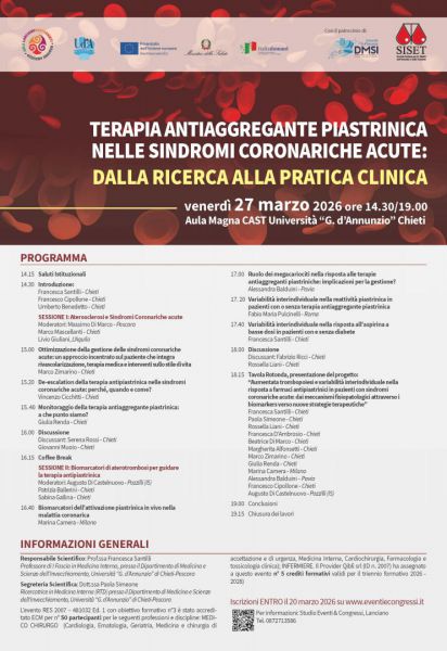 Lunedì, 23 Marzo 2026 ChietiSindromi coronariche e terapie, studiosi a confronto a ChietiL’iniziativa è promossa dal Dipartimento di Medicina, diretto da Francesco CipolloneLe sindromi coronariche acute (SCA) rappresentano una delle principali cause di morbilità e mortalità cardiovascolare a livello globale. Su questo tema di primaria importanza per la salute si confronteranno studiosi provenienti dai migliori centri del Paese nella giornata di venerdì 27 marzo presso l’Aula Magna del CAST dell’Università “D’Annunzio” a Chieti”. L’iniziativa è promossa dal Dipartimento di Medicina, diretto da Francesco Cipollone, che ha affidato la Direzione scientifica del convegno a Francesca Santilli, Professore in Medicina Interna, presso il Dipartimento di Medicina e Scienze dell’Invecchiamento dell'Università. Nonostante i progressi nella rivascolarizzazione percutanea e l’adozione routinaria della duplice terapia antiaggregante piastrinica (DAPT), una quota non trascurabile di pazienti continua a presentare eventi ischemici ricorrenti, inclusa la trombosi di stent, soprattutto nei primi mesi dopo l’evento. La suddetta terapia, basata sull’associazione di acido acetilsalicilico e un inibitore del recettore piastrinico P2Y12, costituisce lo standard terapeutico dopo l’intervento coronarico percutaneo. Tuttavia, è ben documentata una significativa variabilità nella risposta ai farmaci antiaggreganti, con una proporzione di pazienti che manifesta alta reattività piastrinica, condizione associata a prognosi sfavorevole. Parallelamente, strategie alternative di trattamento stanno emergendo per bilanciare rischio ischemico ed emorragico, ma rimane aperta la questione di come identificare in modo accurato i soggetti a maggior rischio trombotico residuo. In questo contesto, il congresso “Terapia antiaggregante piastrinica nelle sindromi coronariche acute: dalla ricerca alla pratica clinica” si configura come un momento di confronto multidisciplinare tra cardiologi, internisti, e ricercatori. La prima sessione affronterà le attuali strategie di gestione delle sindromi coronariche acute, con particolare attenzione alla de-escalation e al monitoraggio della terapia antiaggregante. La seconda sessione approfondirà il ruolo dei biomarcatori di aterotrombosi, della variabilità interindividuale e della biologia del megacariocita nella modulazione della risposta alla terapia farmacologica. “ L’integrazione tra ricerca traslazionale e pratica clinica - sottolinea Santilli - rappresenta oggi una priorità nelle malattie cardiovascolari ad alto impatto sui sistemi sanitari. Comprendere i determinanti biologici della variabilità di risposta ai farmaci antiaggreganti non solo potrà migliorare l’outcome dei pazienti con SCA, ma contribuirà anche a una gestione più sostenibile e appropriata delle risorse sanitarie, in linea con gli obiettivi del PNRR e delle strategie europee per le malattie croniche non trasmissibili. |