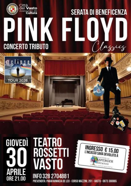 Giovedi 30 Aprile 2026 alle ore 21,00 nella suggestiva cornice del Teatro Rossetti di Vasto andrà in scena il concerto degli ECLIPSE interamente dedicato alla musica dei PINK FLOYD dal titolo Classics.