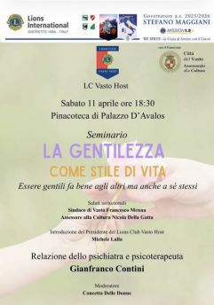Un invito alla riflessione, ma anche all'azione concreta: è questo lo spirito del seminario promosso dal Lions Club Vasto Host, in programma sabato 11 aprile alle ore 18:30 presso la Pinacoteca di Palazzo D'Avalos, dedicato al tema della gentilezza come elemento essenziale nelle relazioni umane e nei percorsi di cura.