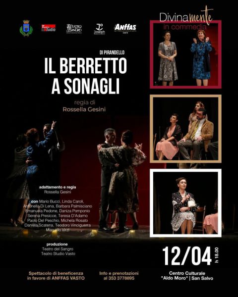 Sabato, 11 Aprile 2026 San SalvoDomenica la presentazione de 'Il berretto a sonagli'Lo spettacolo di beneficenza a sostegno del laboratorio teatrale di Anffas VastoDomenica 12 aprile, alle ore 18, nella cornice dell'Auditorium del Centro culturale ‘Aldo Moro’ a San Salvo, prenderá il via il terzo e ultimo di una serie di spettacoli di beneficenza del Teatro del Sangro-Teatro Studio Vasto e dell’associazione Joseph a sostegno del laboratorio teatrale di Anffas Vasto. Con la regia di Rossella Gesini l'appuntamento finale del 12 aprile sarà con la rappresentazione dell’opera di Pirandello “Il berretto a sonagli”. ”Ringraziamo – scrivono gli organizzatori – l’amministrazione del Comune di San Salvo, l'assessore Gianmarco Travaglimi e la consigliere delegata alla Cultura Maria Travaglini per il patrocinio concesso. La prenotazione è obbligatoria al numero 353-3778895. Ingresso unico 10 euro. Il progetto di beneficenza culminerà con lo spettacolo "Divinamente in commedia: Maestre chist chi sò", una produzione di Anffas Vasto con il supporto del Teatro del Sangro-Teatro Studio Vasto e dell’associazione Joseph. Successivamente verrà comunicata la data di rappresentazione. Vi aspettiamo in tantissimi!" |