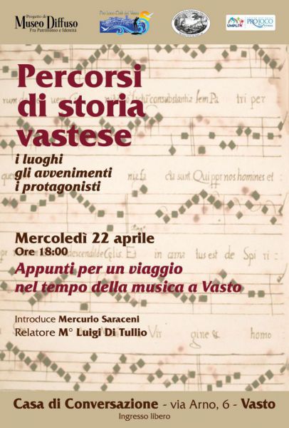 Mercoledì 22 aprile, alle ore 18:00, presso la Casa di Conversazione (via Arno, 6 – Vasto), si terrà l’incontro dal titolo “Appunti per un viaggio nel tempo della musica a Vasto”, un’occasione di approfondimento e riflessione sul patrimonio musicale locale, inteso come elemento identitario e testimonianza viva della storia cittadina.