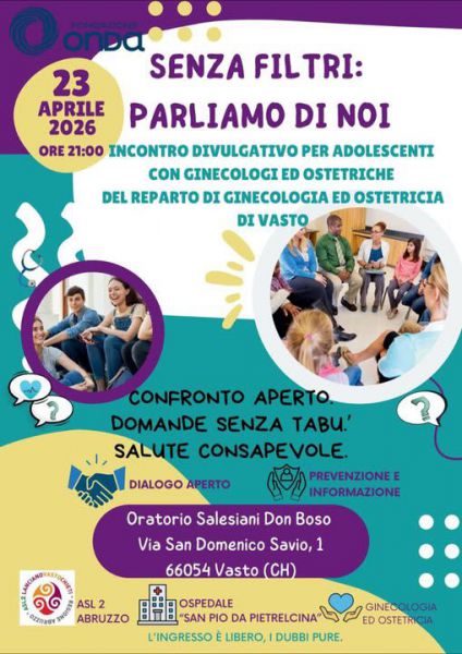 Giovedì, 23 Aprile 2026 Vasto“Senza Filtri: Parliamo di Adolescenza e Salute”Appuntamento a Vasto all’Oratorio Salesiani Don BoscoQuesta sera alle ore 21, all’Oratorio Salesiani Don Bosco di Vasto, “Senza Filtri: Parliamo di Adolescenza e Salute”, un incontro speciale dedicato ai ragazzi, ma aperto anche ai genitori che vogliono accompagnarli o anche essere presenti da soli, in quanto genitori “dubbiosi”, in questo percorso di crescita. |