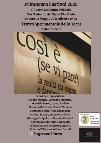 Mercoledì, 29 Aprile 2026 VastoSabato 2 maggio al teatro madonna dell’Asilo “Così è (se vi pare)” di Luigi PirandelloBella iniziativa della Compagnia Teatrale della Torre aperta a tutti gratuitamenteIl confine sottile tra realtà e finzione, tra follia e saggezza, si appresta a scuotere il pubblico vastese. Sabato 2 maggio 2026, alle ore 19:00, il sipario del Teatro Madonna dell’Asilo si alzerà su uno dei capolavori assoluti del teatro del Novecento: “Così è (se vi pare)” di Luigi Pirandello. Scritta nel 1917, l’opera rappresenta il manifesto della filosofia pirandelliana. La vicenda si snoda attorno all’arrivo in una cittadina di provincia del signor Ponza e della suocera, la signora Frola. Il mistero che avvolge la vita della moglie di Ponza scatena la curiosità morbosa dei vicini, dando vita a un’indagine frenetica che sfocia nel grottesco. Chi è davvero la signora Ponza? La figlia della signora Frola o la seconda moglie del signor Ponza? La risposta, come suggerisce il celebre titolo, rimane sospesa nell’impossibilità di conoscere una verità oggettiva. La messa in scena della Compagnia Teatrale Sperimentale della Torre propone una lettura moderna del dramma, sottolineando l’attualità del tema della “maschera” in un’epoca dominata dall’apparenza e dal giudizio social. Informazioni Utili Data: Sabato 2 maggio 2026 |