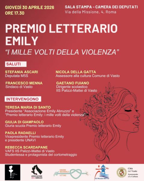 Giovedì, 30 Aprile 2026 VastoLa presentazione della quarta edizione del Premio Letterario EmilyIn programma a Roma nella Sala Stampa della Camera dei deputatiOggi, alle 17,30, a Roma, alla Sala Stampa della Camera dei Deputati, è in programma la conferenza stampa di presentazione della quarta edizione del Premio Letterario Emily. Una manifestazione che nel corso degli anni continua a crescere suscitando interesse nel mondo della Cultura regionale e nazinale. |